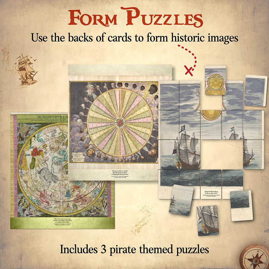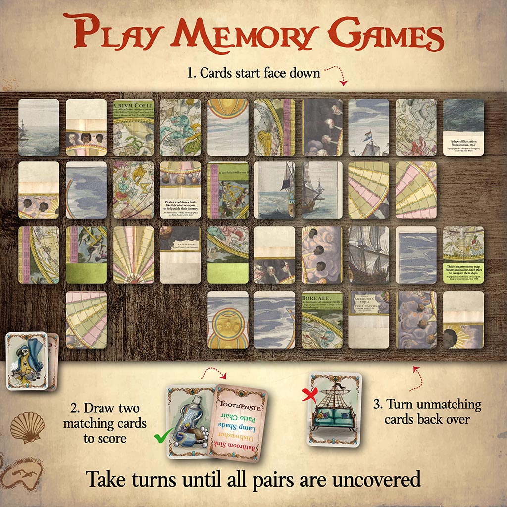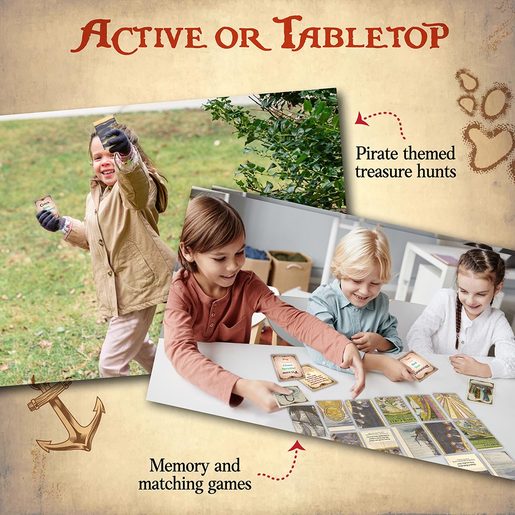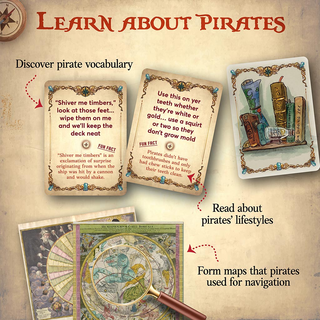 Welcome, Matey! Set sail for six different pirated themed games, including three levels of scavenger hunts, a memory game, matching game and three puzzle options. Each game option teaches new skills – but without getting in the way of an exciting pirate’s adventure! Includes sixty game cards, one treasure map (instructions) and pirate’s booty (a glowing gem).